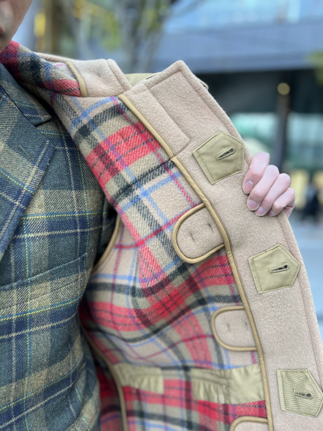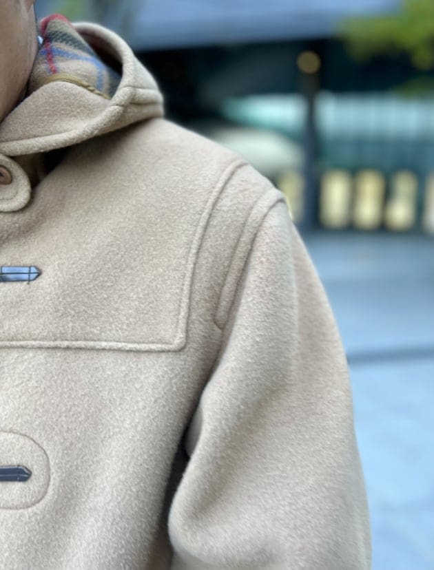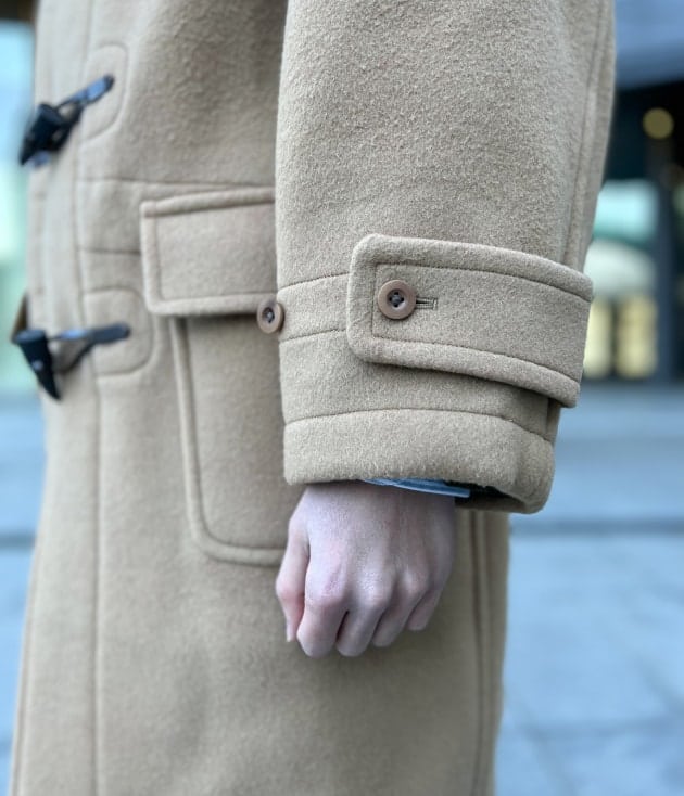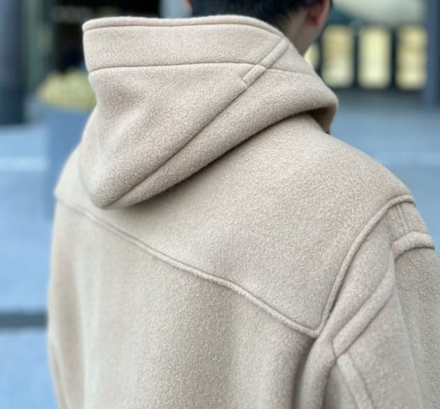 今回はSuper100'sの極細繊維のウールを超高密度にて織り上げたダブルクロスメルトンを使用。ダッフルコートらしい武骨で、重厚感がある見え方ながらも非常に滑らかで柔らかな肌触りに仕上がっているのがポイントです。