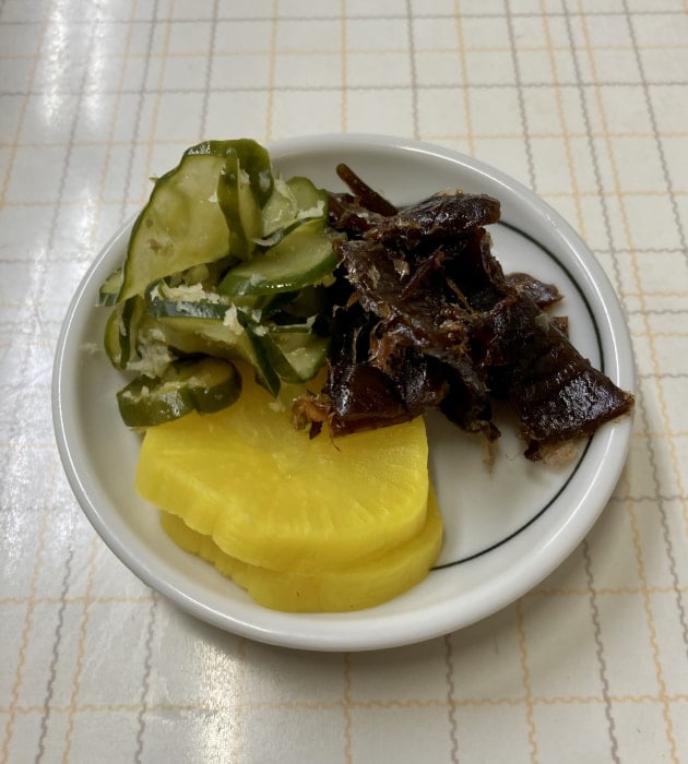 非常に美味。“胡瓜の糠漬けに生姜をあえたもの”、“昆布と椎茸、山椒”そして“たくあん”。