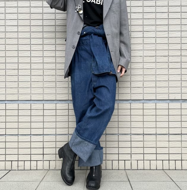 ツナギの上にテーラードジャケットを羽織ったコントラスト強めの装い。