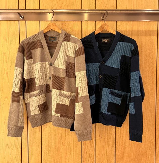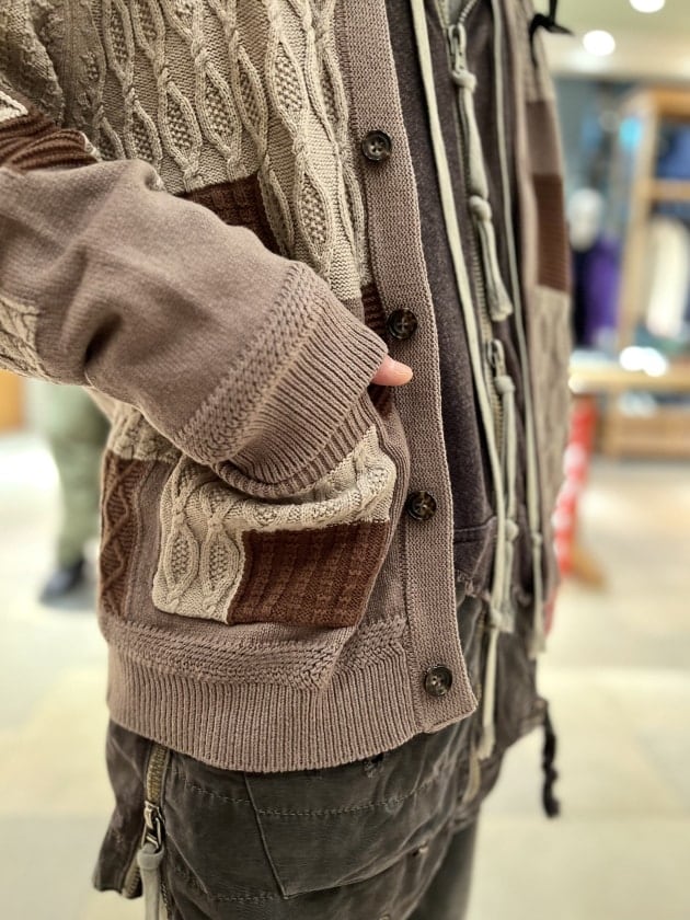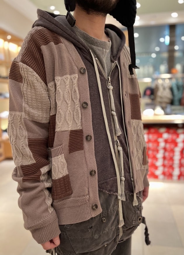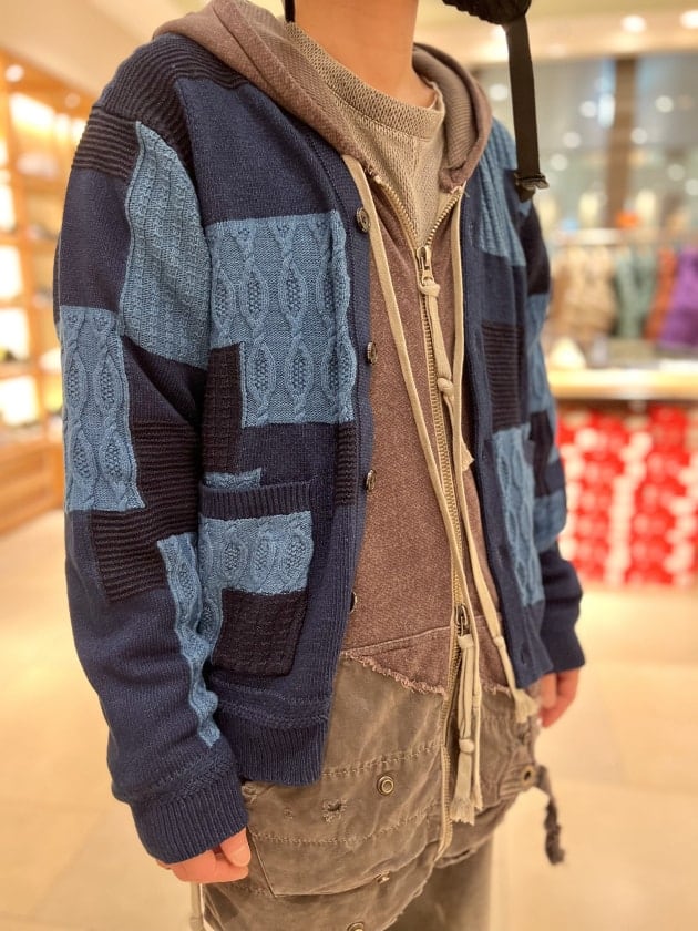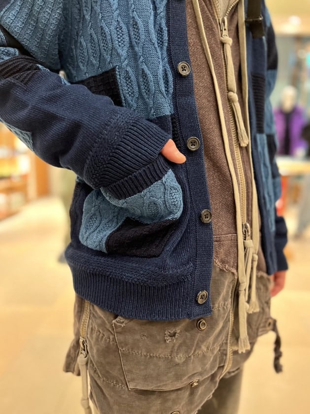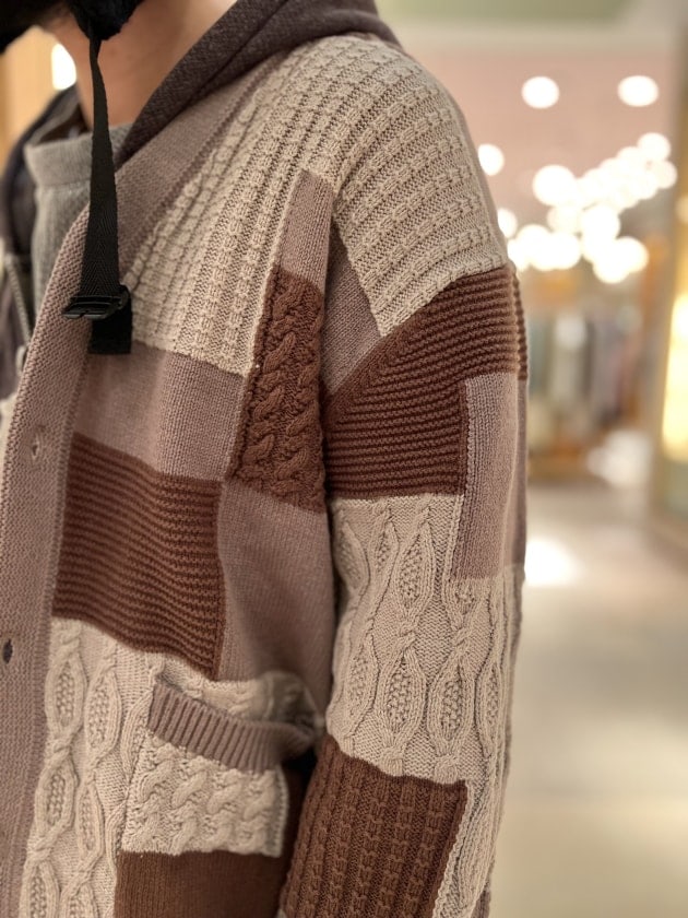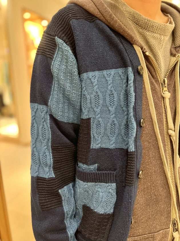 今の時期でも取り入れやすいパッチワーク調のカーディガン。