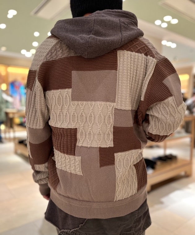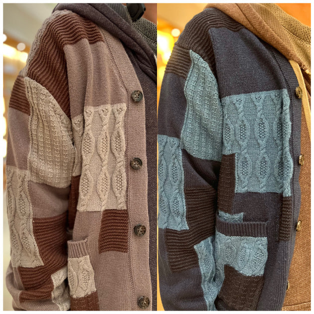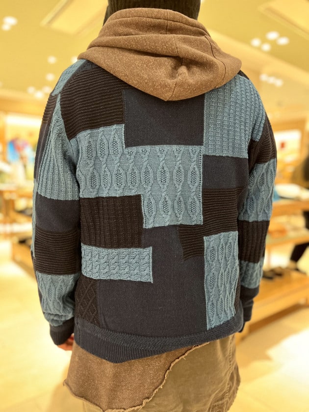 こちらはそれぞれ異なる編み地をジャカードにて、パッチワーク調に見せており、
