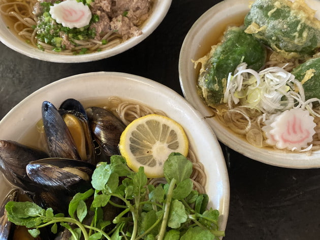 手前が「ムール貝の酒蒸しにクレソン蕎麦」