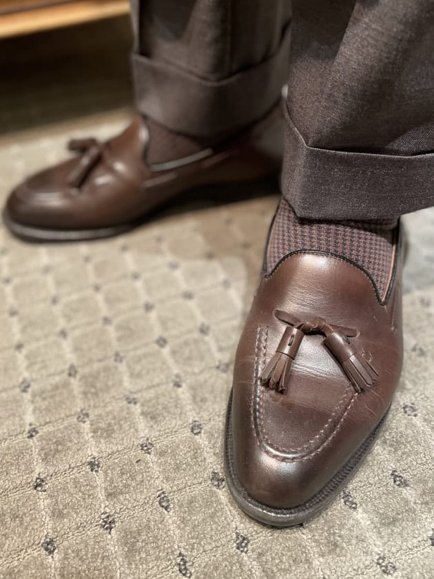 足元はブラウンカーフのタッセルローファー。全体のスポーティーさに合わせるように軽めのシューズ。ソックスのブラウンのハウンドトゥース柄も主張しすぎないアクセントとしてS様は効果的に使われています。