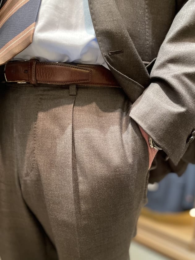 以前にお求めいただいたBrilla per il gustoのDORMEUILのモヘアウールスーツのスタイリング。カラーはダークブラウン。暖色系のスーツに寒色系のサックスブルーのオックスフォードシャツですっきりした印象に。タイは〈FRANCO BASSI(フランコ バッシ)〉のストライプ。このストライプの間隔もすっきりまとめるのに効果的。また、ネイビーベースカラーにブラウン系のストライプとスーツ、シャツのカラーを拾うことでも綺麗にまとめられています。