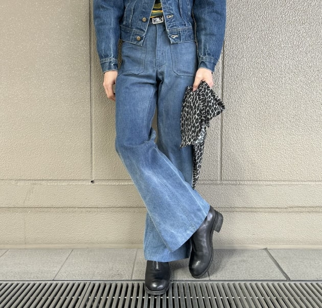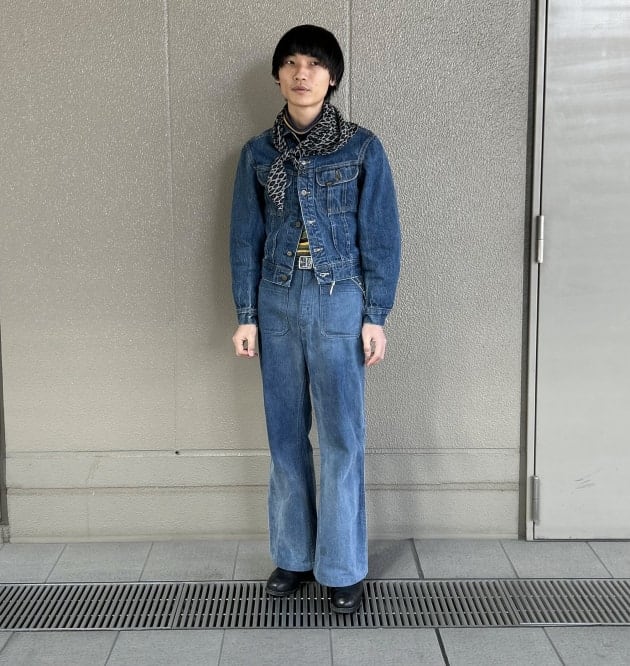 そんなデニムonデニムがラギットで男らしい感じにならないように、マルチボーダー(インナー)とかレオパードのスカーフ、PVCのベルトとかPOPな感じのアイテムを合わせてコーディネートしました。