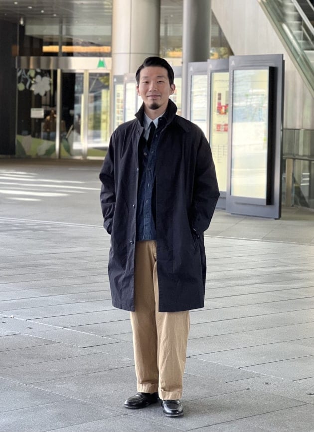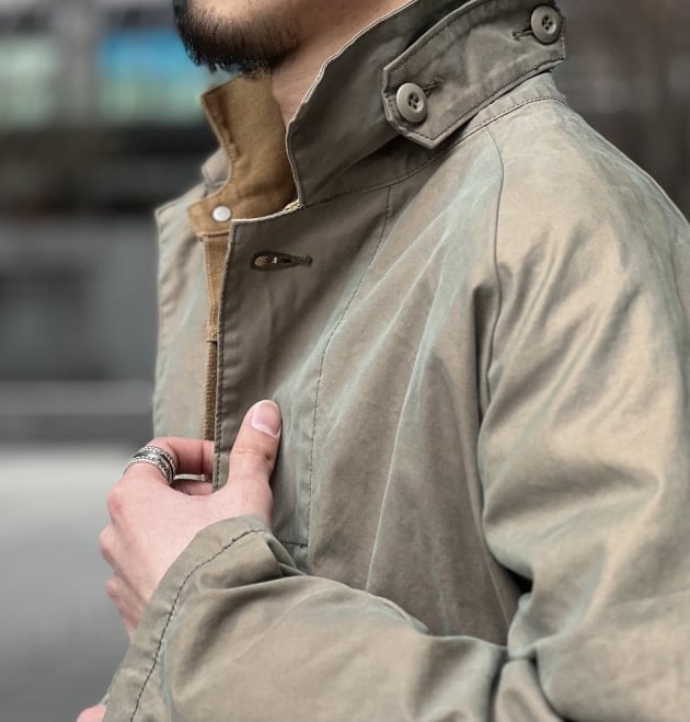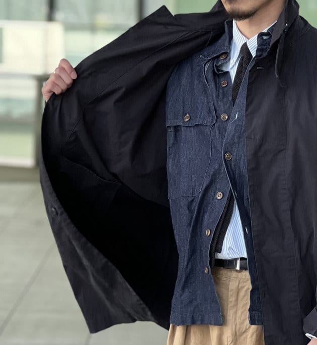風がなくても、チンストラップを留めて、あえて下のボタンは留めずにAラインの出るシルエットを強調させる"こなし"も個人的には好きな着方です。