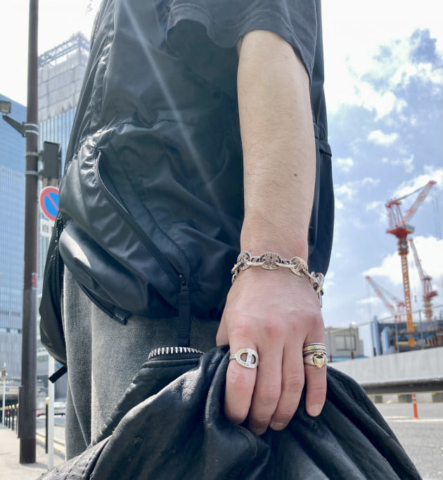 ナイロンアイテムと“かけ離れたイメージ”のアクセサリーなどで纏めると新鮮なコーディネートになります。