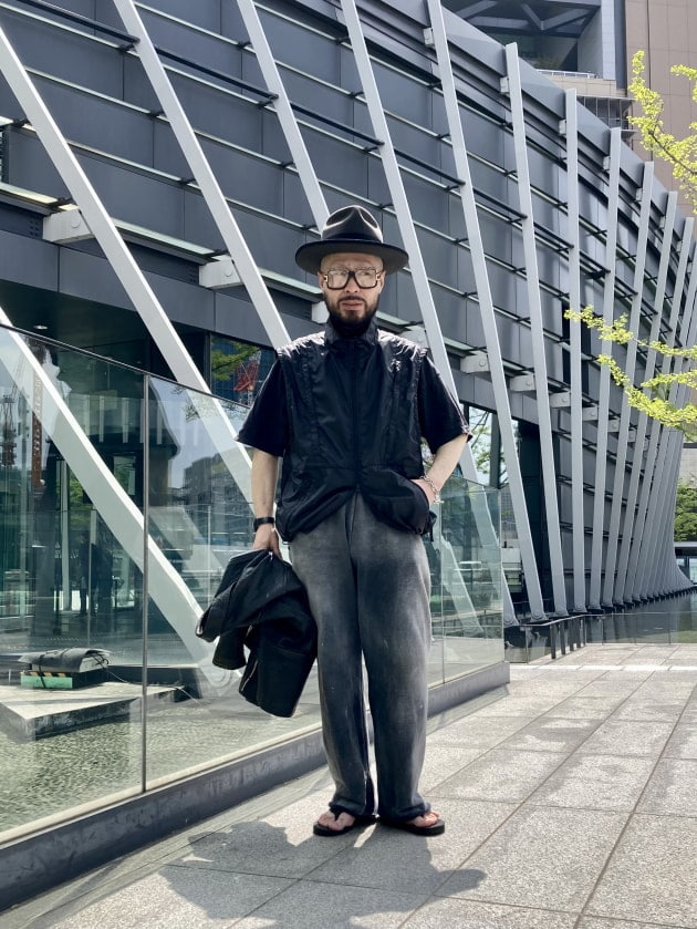スウェットパンツとサンダルで、ゆるい・テキトー感のあるイメージのスタイリングにしました。