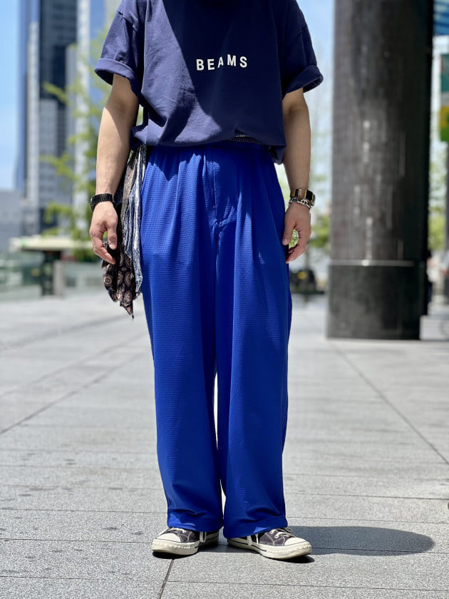 オーバーサイズでタックインするとパンツに被さる“ゆとり”の量が多くなり、全体のバランスにメリハリが出ます。