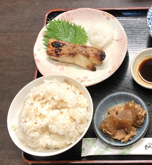 付け合わせの“魚と大根の炊いたん”、すまし汁も美味(≧∇≦)