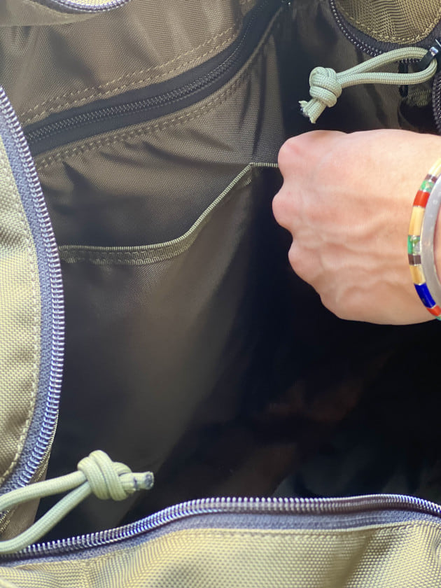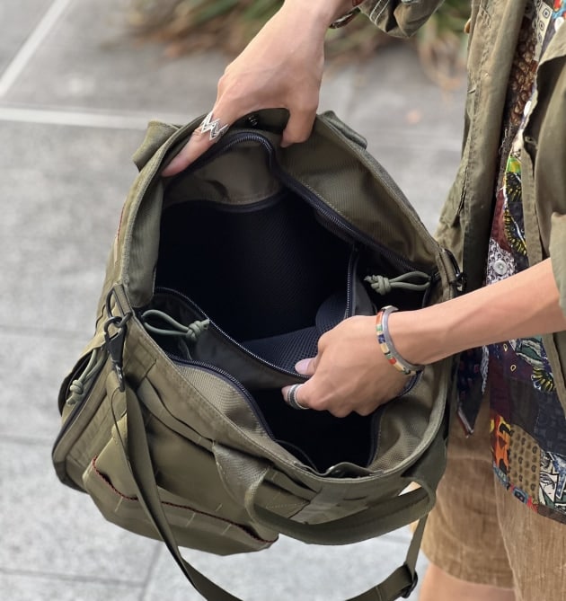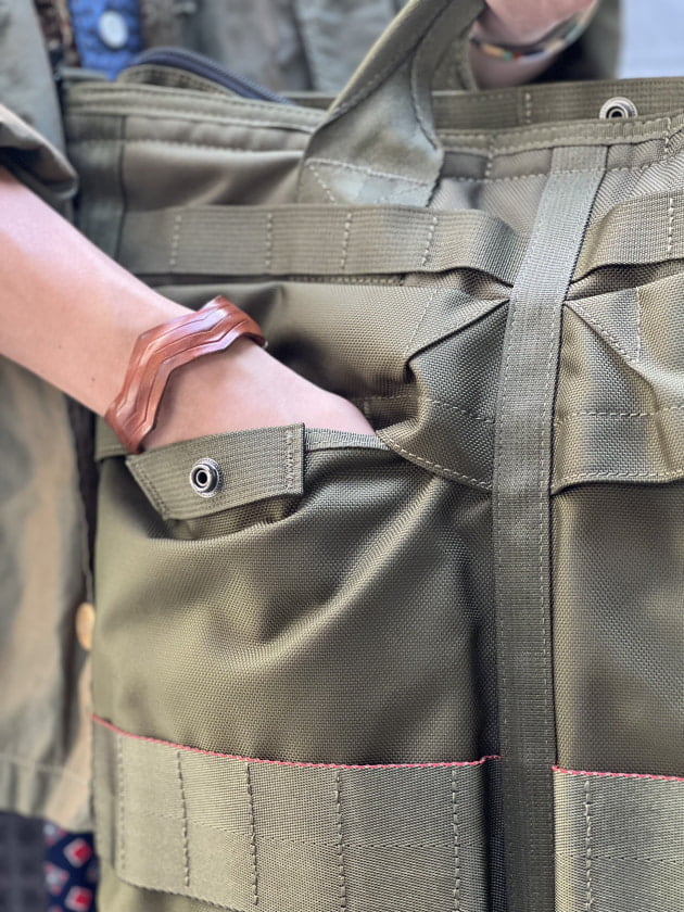 ペットボトルや折り畳み傘が収納出来る様にアップデートしており、日常使いしやすいディテールにしています。