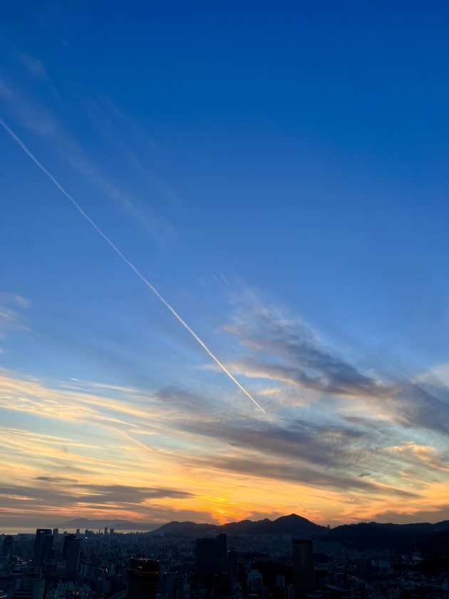 夕焼けと飛行機雲が綺麗だったのでパシャリ。