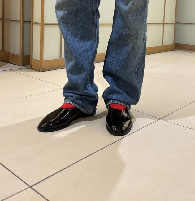 ブラックのレザーシューズに、真っ赤なソックスです!いかがでしょうか?