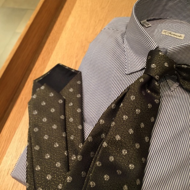 本日の1本。 2018.05.10 おはようございます。上西でございます。さて、本日もオススメのネクタイをご紹介します。こちらでございます。ドレイクスのドットタイです。オリーブグリーンの色味が絶妙ですよね。クラシカルなネイビースーツやグレースーツに合わせたいですね。シャツはタブカラーのストライプシャツを合わせています。定番的な柄のドットだからこそ、少し変わった色味やパターンのものを選んでみませんか?ぜひ、店頭にてご覧ください。お待ちしております。