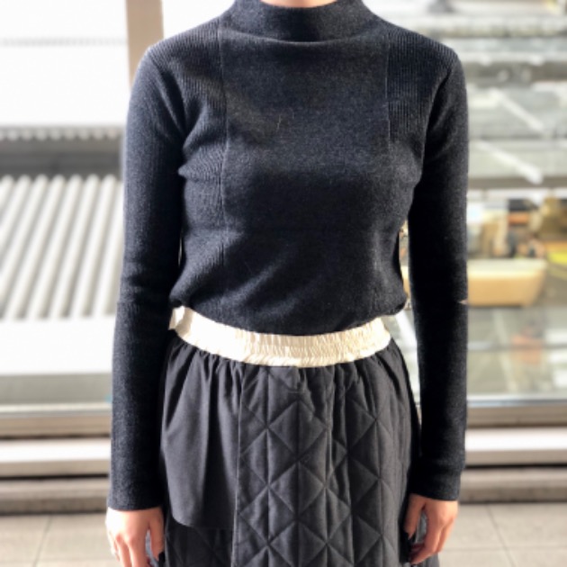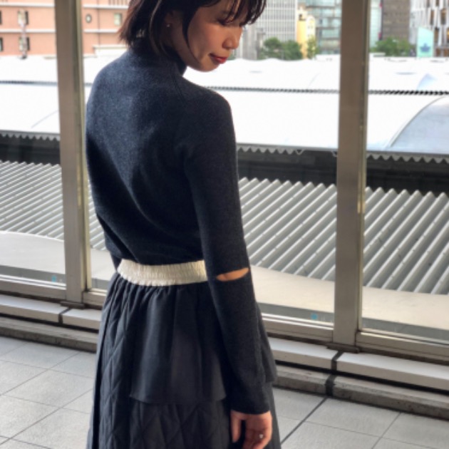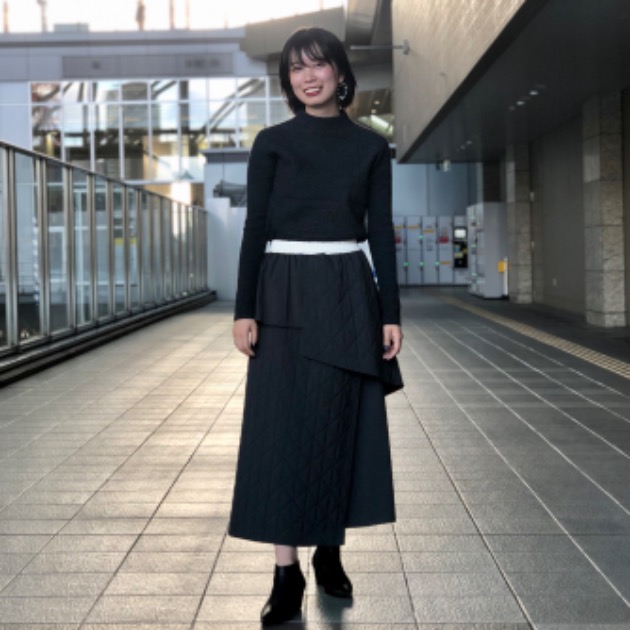 着用しているスカートは、スーツ生地とユニークなパターンのキルティング生地とを掛け合わせた特徴的なデザインのアイテム。一見奇をてらったようですが、同系色でまとまり、シンプルなシルエットに仕上がっているため、非常に使いやすいことでしょう。