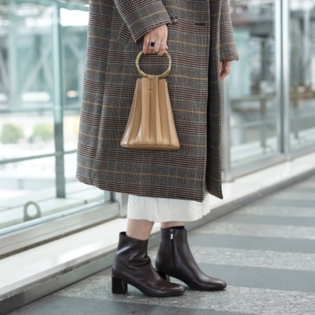 タートルネックニット、スカート、ブーツは全てモノトーンカラーなので、スタイリングのチェック柄・ブラウン(ベージュ)カラーが引き立って見えます。