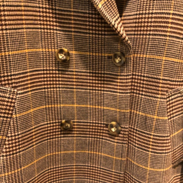インナーのブラウスはコートのチェックに含まれるブラウンを拾って、統一感を出しています。