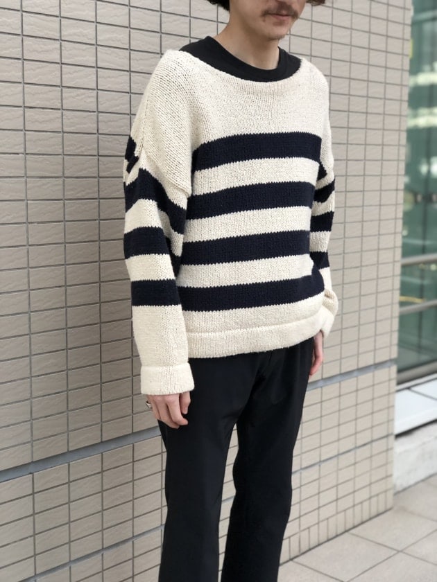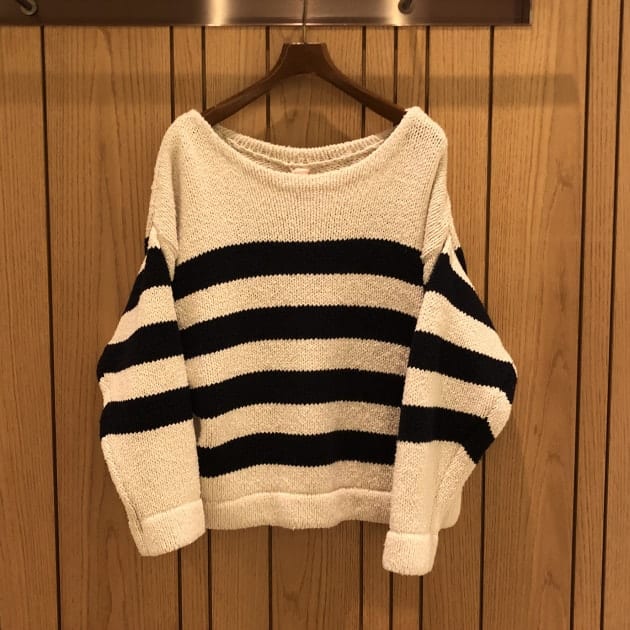 短めの着丈に対しゆとりのある身幅、ワイドなボートネック。