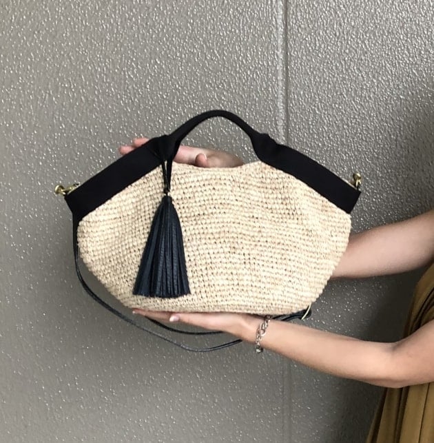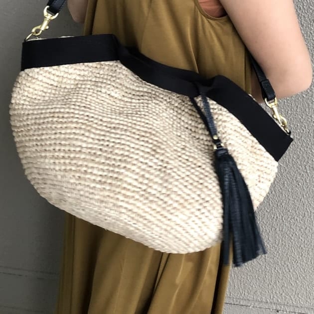 ナチュラルな素材感とブラックカラーが上品なバッグです。マチが大きく収納性も優れています。