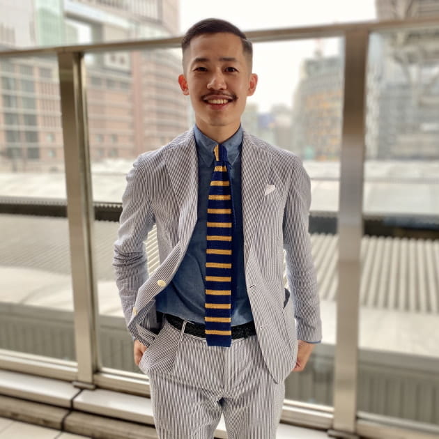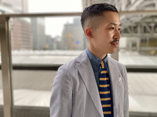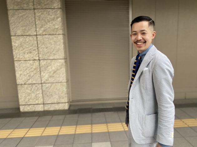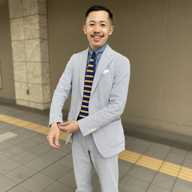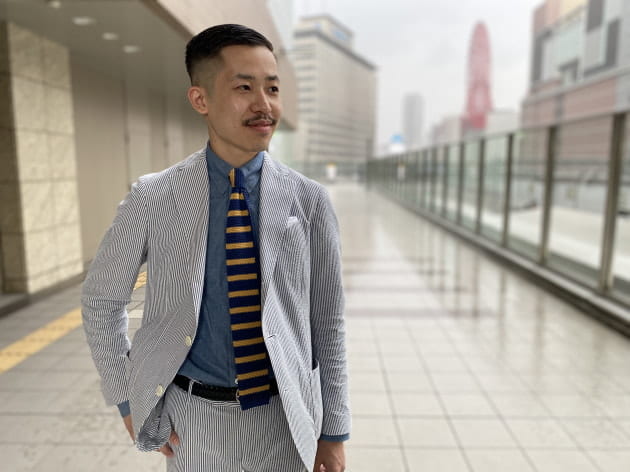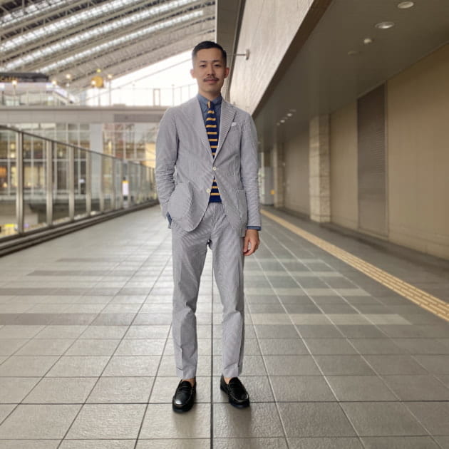 「梅雨があけたので、初めてシアサッカーのセットアップを着用しました。シアサッカーは今の時期でもベタつかず快適に着用できるので良いですね。