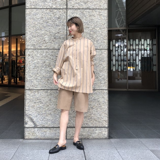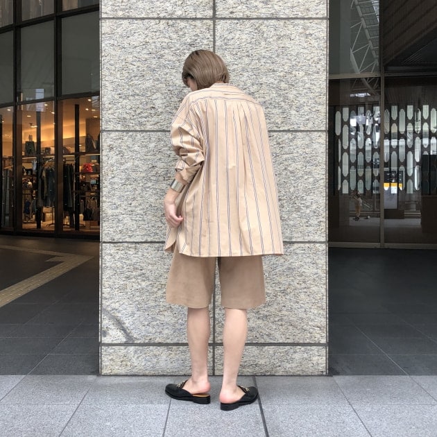 細身のパンツは勿論合いますが、季節の変わり目だからこそできる長袖にハーフパンツの組み合わせにしました。