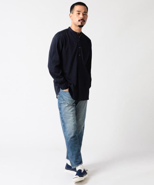 少し肩の力を抜いた、リラックスした雰囲気のバンドカラーシャツ。