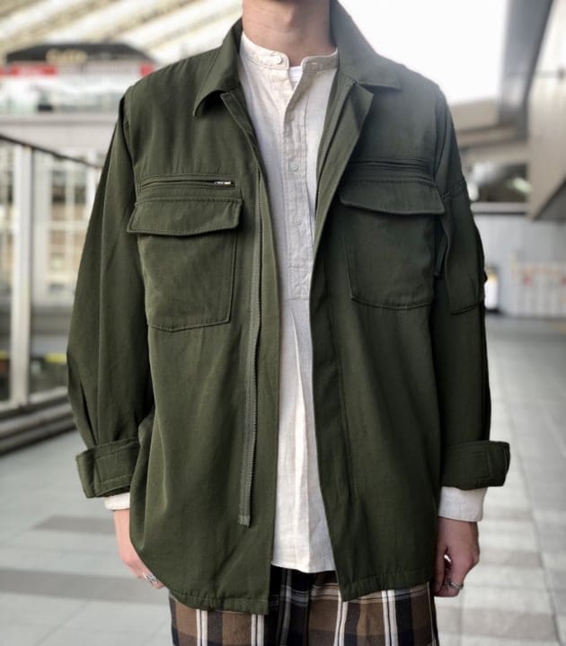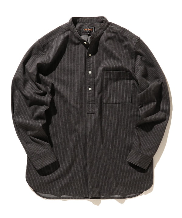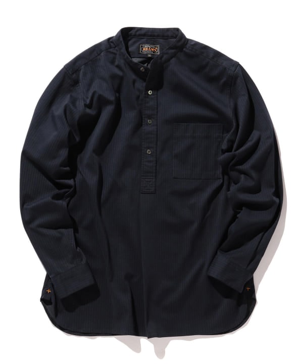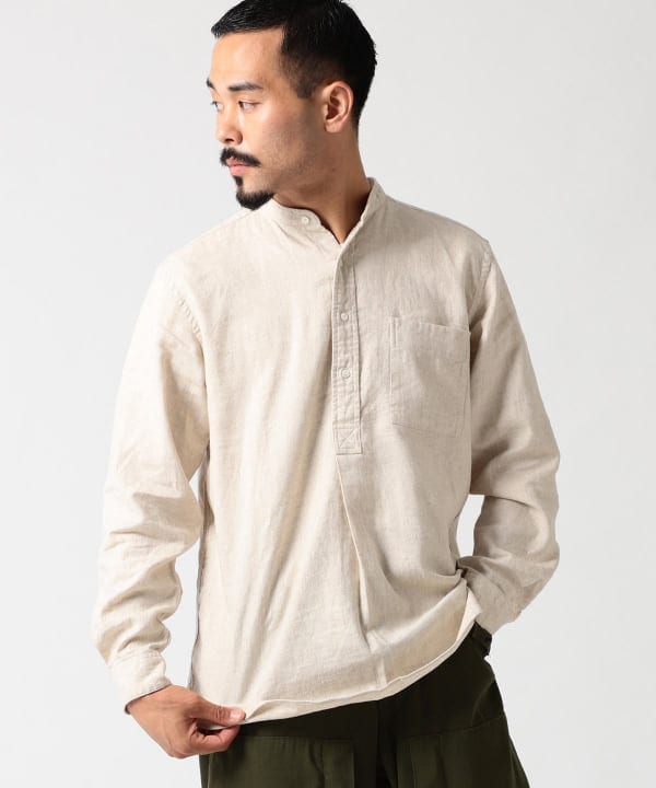ヨーロッパではワークスタイルやミリタリーでよく採用されているバンドカラーシャツ。