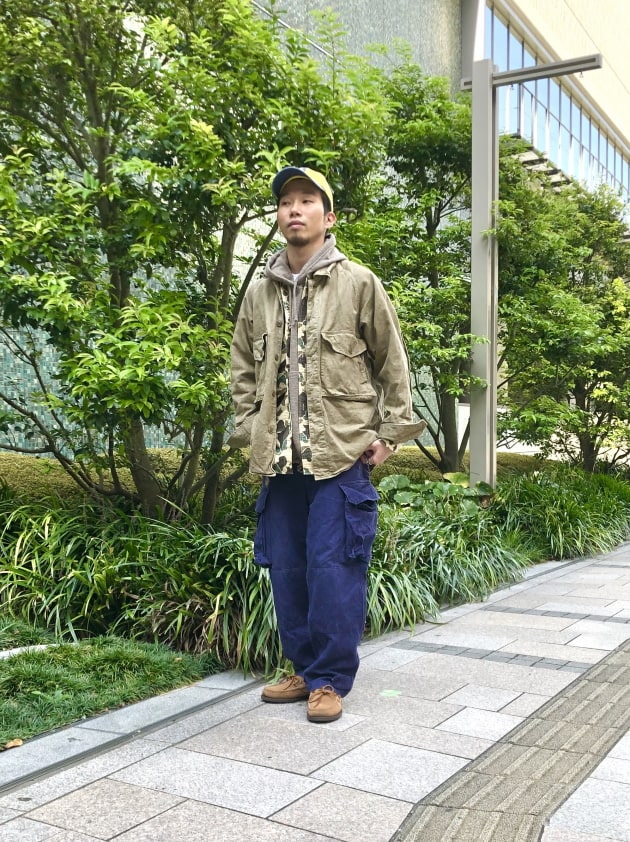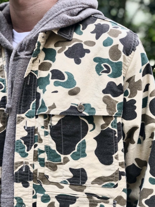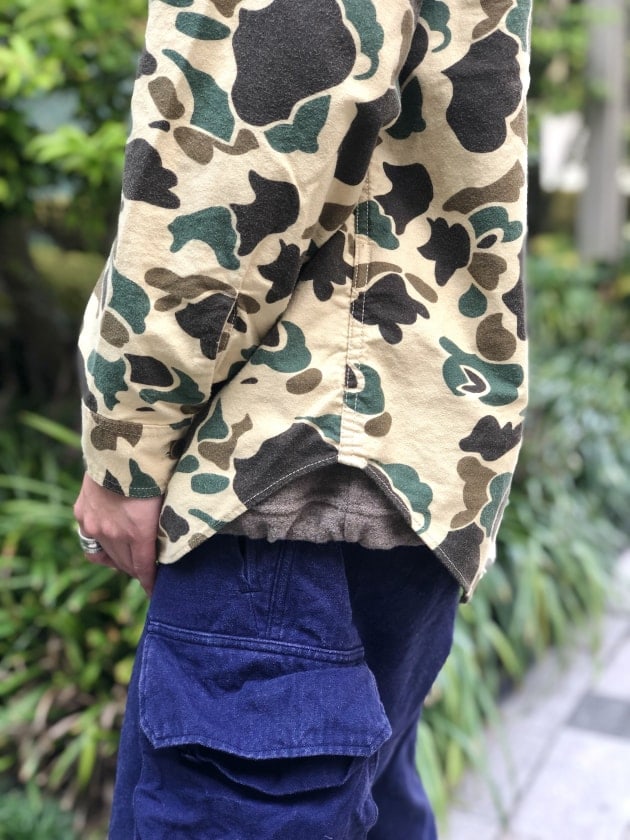 私も普段から、カモ柄は避けてきましたが改めて着てみるとミリタリーやハンティングといった背景があるからか武骨な、男らしい柄でBEAMS PLUSのウェアとも相性抜群。