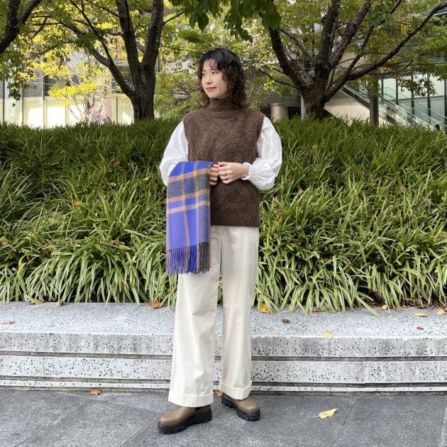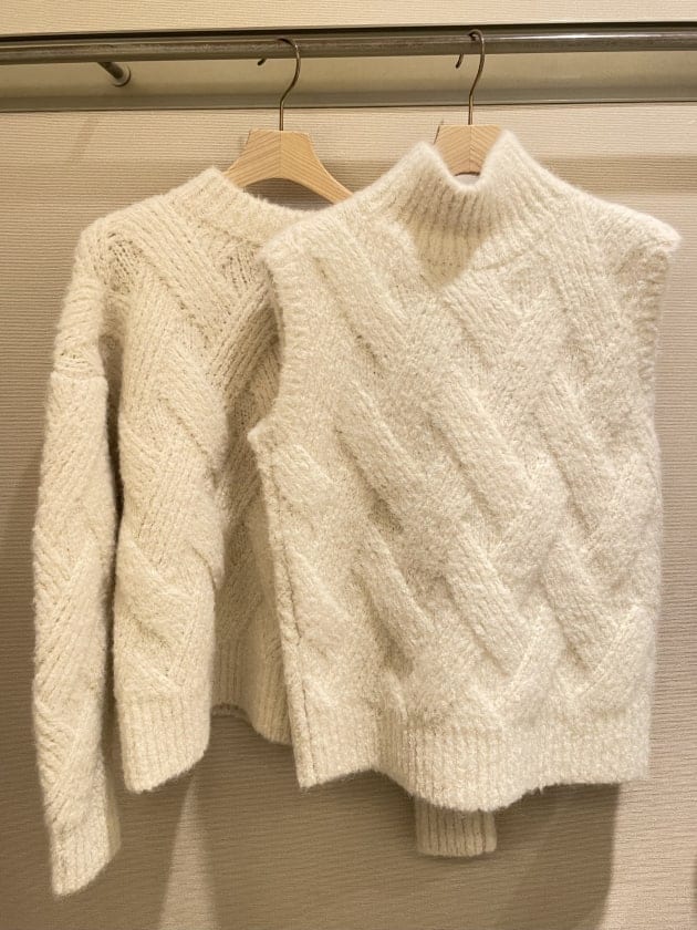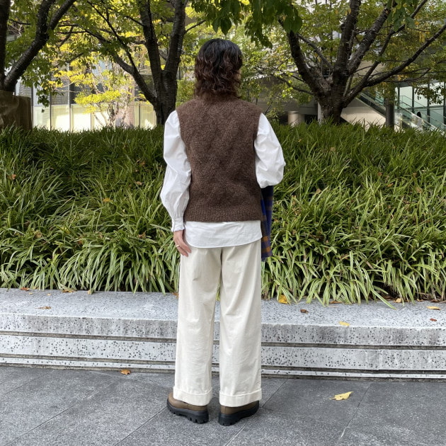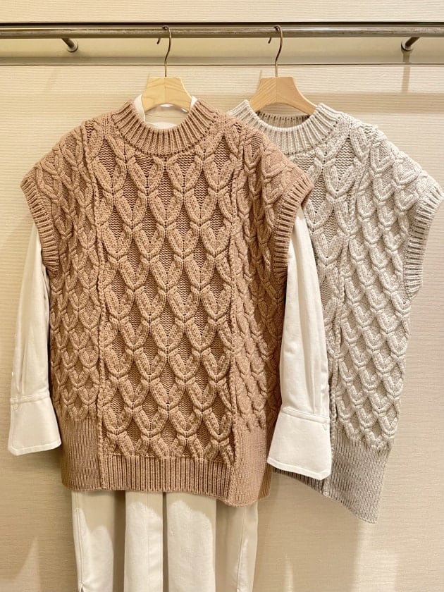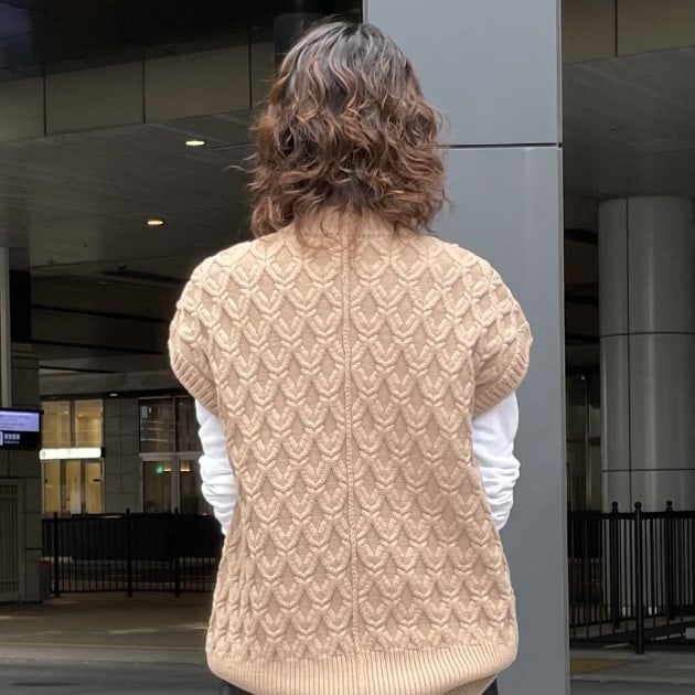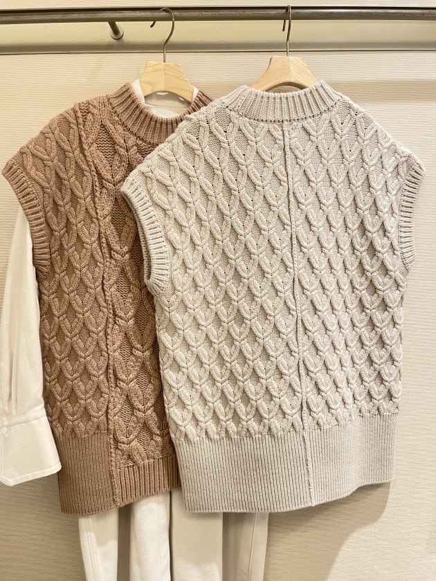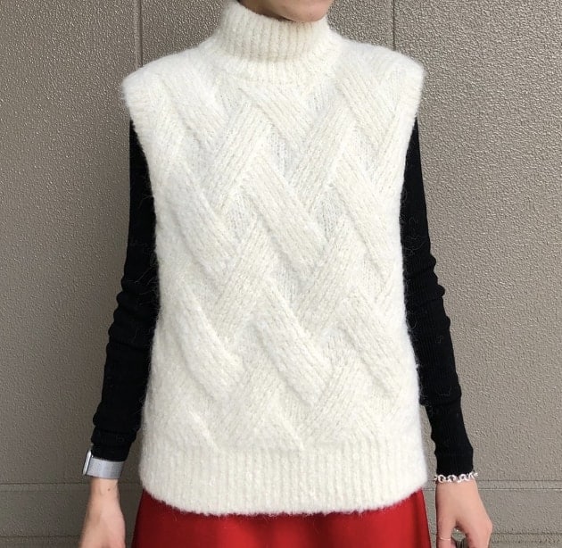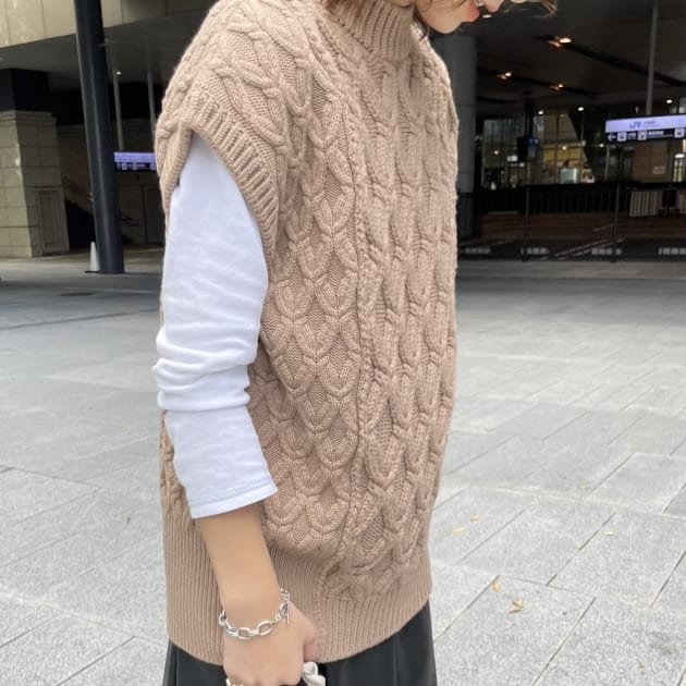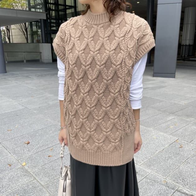 編み模様を活かし、ベストの下にはシンプルなカットソーやタートルネックを合わせるスタイルがお勧めです。