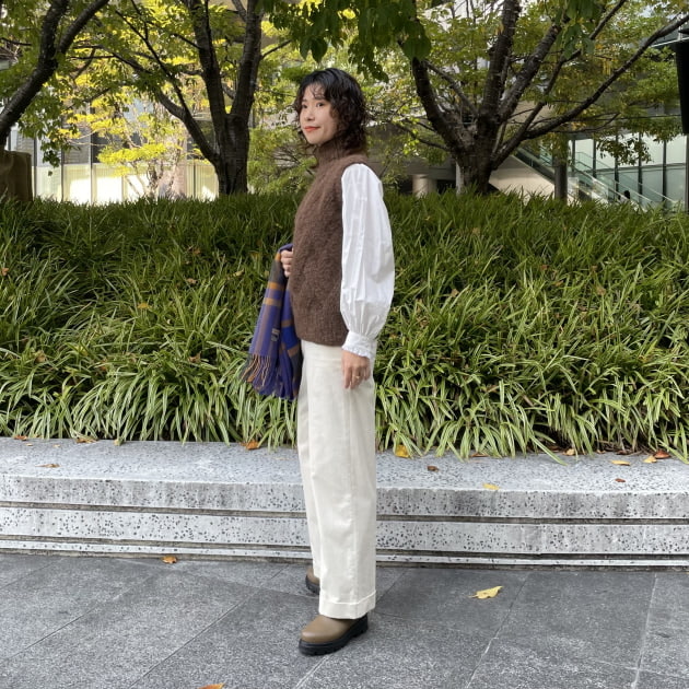 タートルネックベストは冬らしくてなんだか良いですよね。私は普段タートルネックの上からベストを重ねていることが多いので このタイプも一つあると良いな〜と思いました.