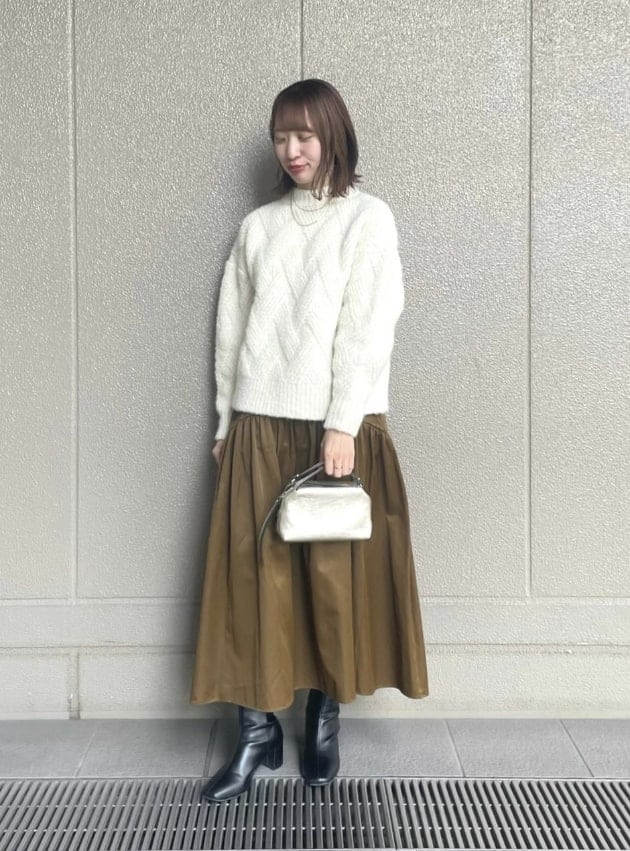 BROWN×WHITEでスタイリングしてみました〜. 下にはアームにボリュームのあるブラウスをレイヤードしています。
