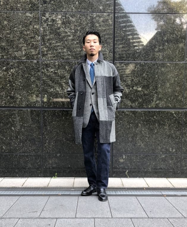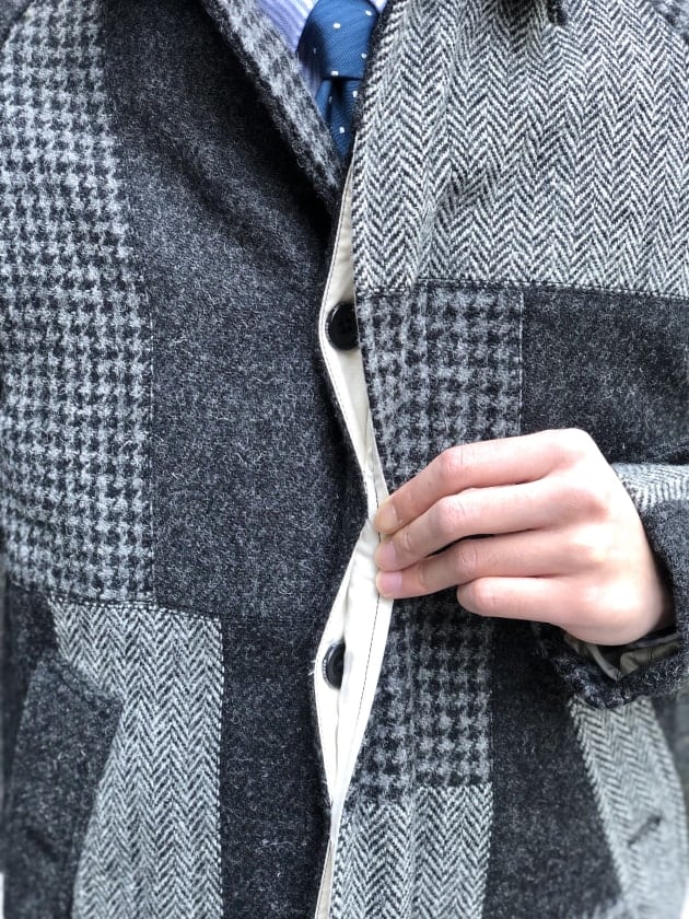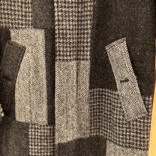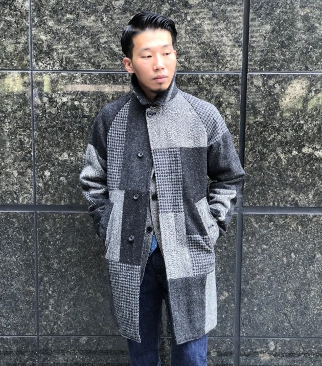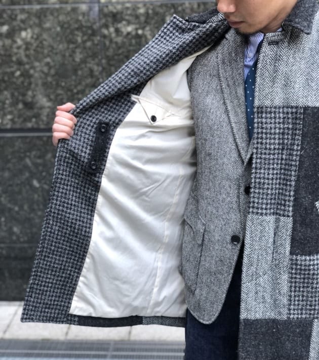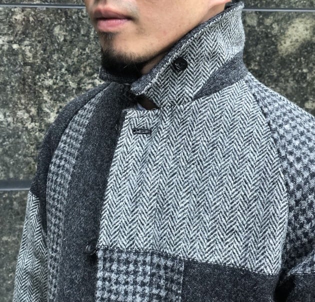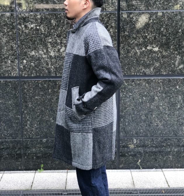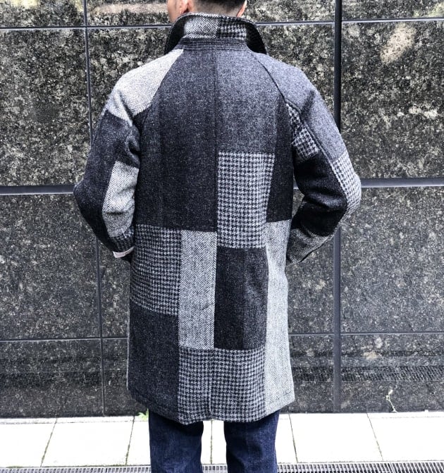 ハリスツイードを贅沢に使用したパッチワークのバルマカーンコート。