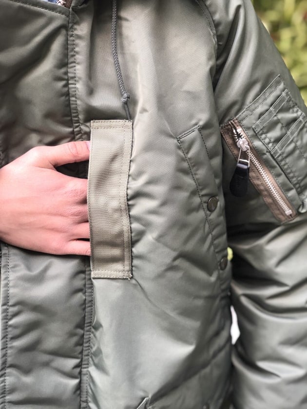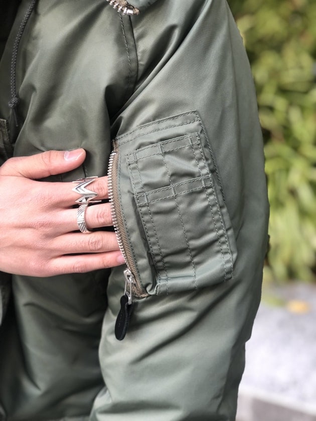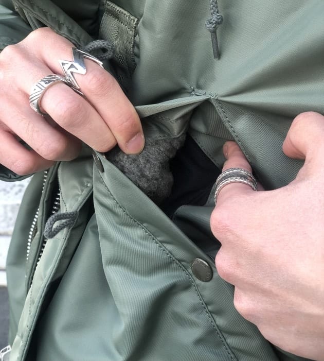 ドローコードが搭載しており、絞りを入れるとシルエットの変化も楽しめますしより体に密着する事で保温力も格段に上がります。