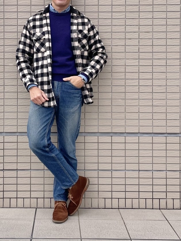 〈Drake's(ドレイクス)〉のシャンブレーシャツの上から羽織るだけではこの時期寒々しいので〈DRUMOHR(ドルモア)〉のDONNACHIEネームのニットをいれました。足元は〈Paraboot(パラブーツ)〉のアヴィニョンと迷いましたが、〈Clarks(クラークス)〉のデザートブーツに。ビームス ハウス店舗ではできない、したくないコーディネートですね。