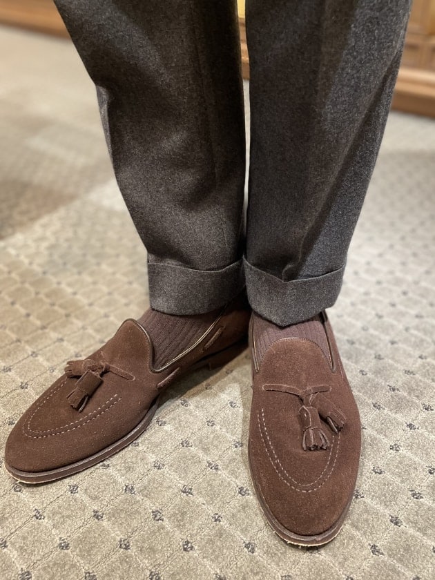 足元はこちらのダークブラウンスエードのタッセルローファーでバランスよく。Vゾーンをやや硬めにされているためペニーローファーではない選択。なるほど。