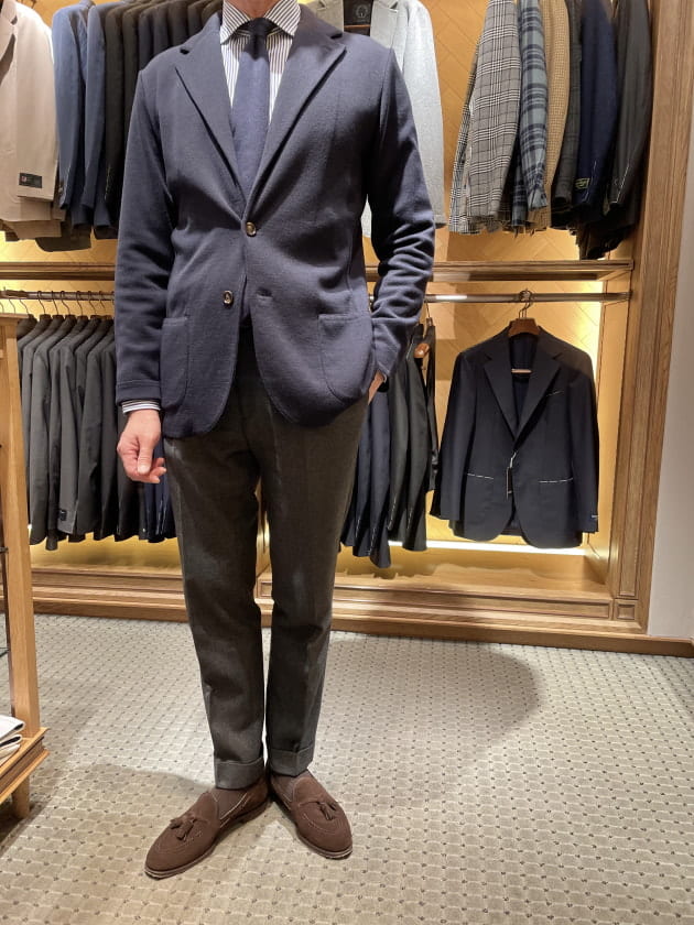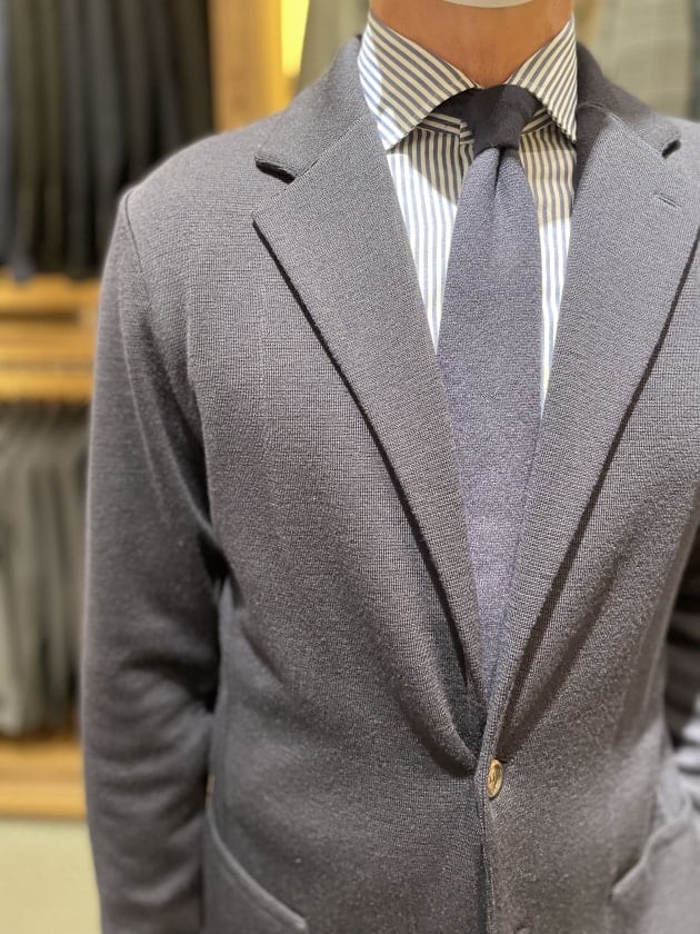 しかしよく見てみるとこちらのネイビージャケットはニットジャケットでした。そのニットジャケットにウールタイを合わせて質感を調整されたようです。