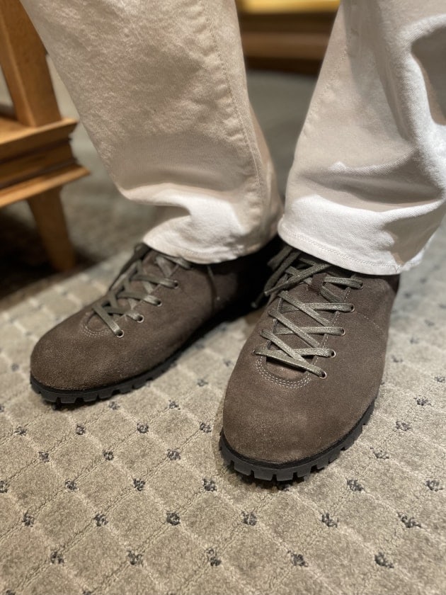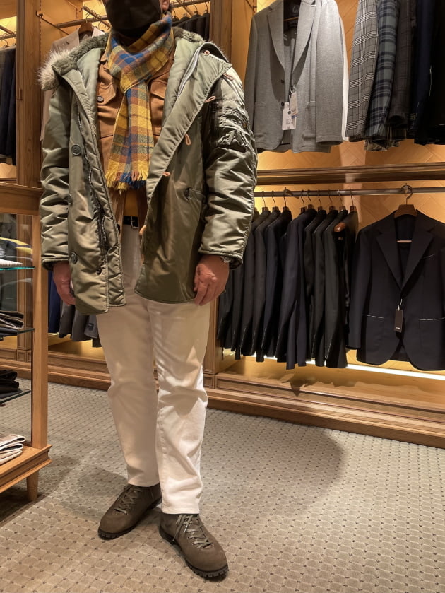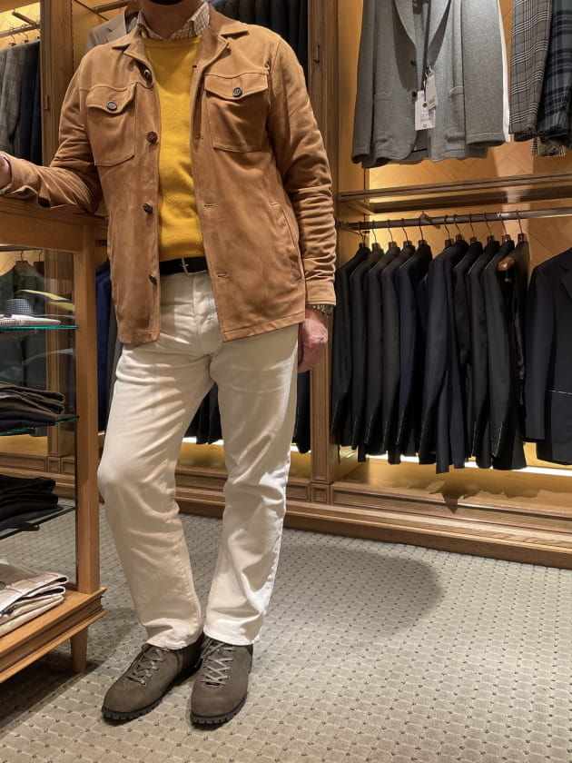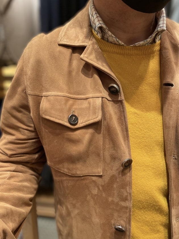 スエードジャケットは3年ぐらい前の〈EMMETI(エンメティ)〉。当店でもかなり人気のアイテムでした。シャツは先々シーズンの〈Drake's(ドレイクス)〉。スエード、ニットとも相性よし。ニットはもはや説明不用のあそこの。たしかK様もパープルとグリーンと3色お持ちのはず。