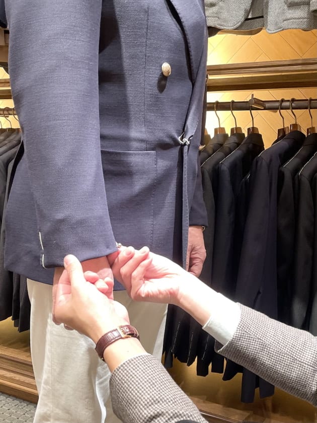 4つボタンのダブルがK様にささったようで、取り寄せ依頼を受けていました。袖はいつも皺で上がってくるので長めの仕様。