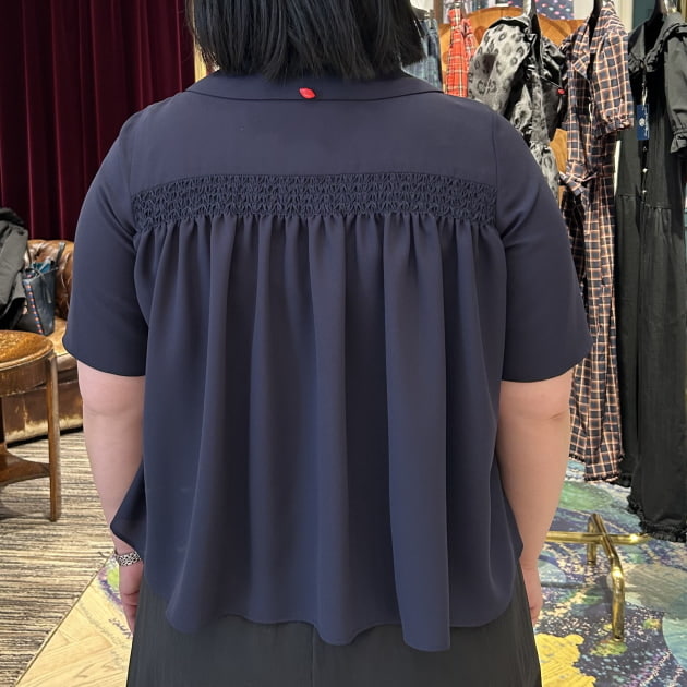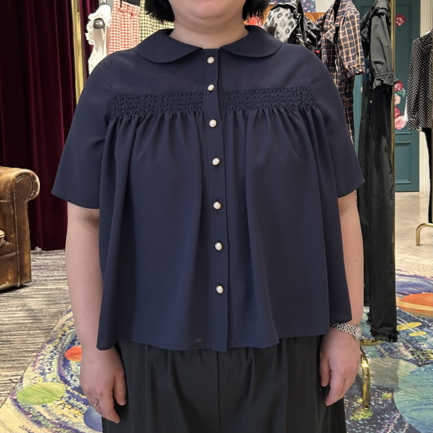 胸元と背中にスモッキングを施し、Aラインに広がるブラウスです。