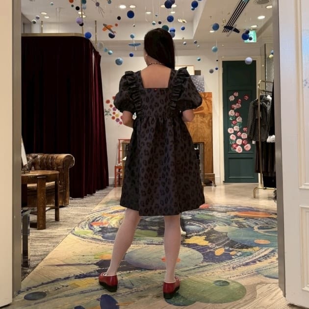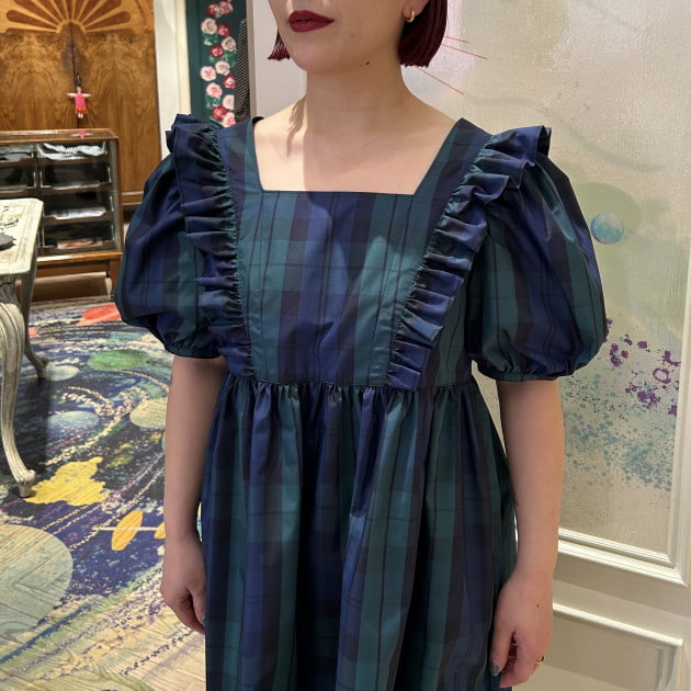 肩にあしらったフリルとパフスリーブ、少し短めの丈がとても可憐なドレスです。