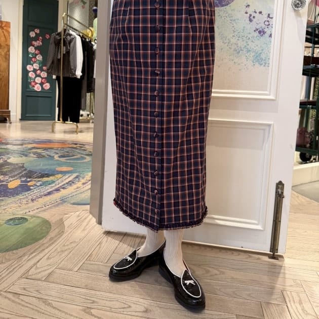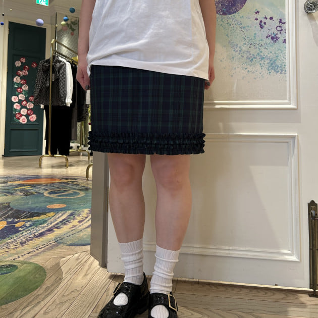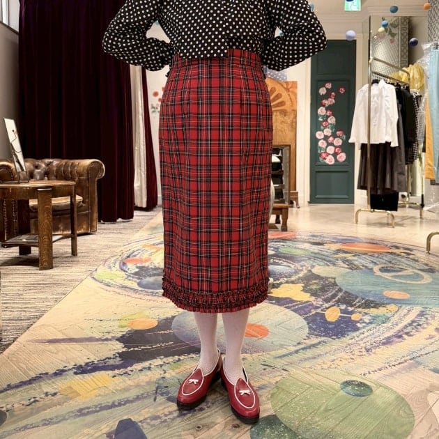 通年ご着用いただけるフリルタイトスカートは、こちらのタータンチェック5色からお選びいただけます。
