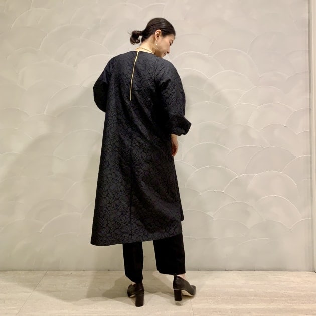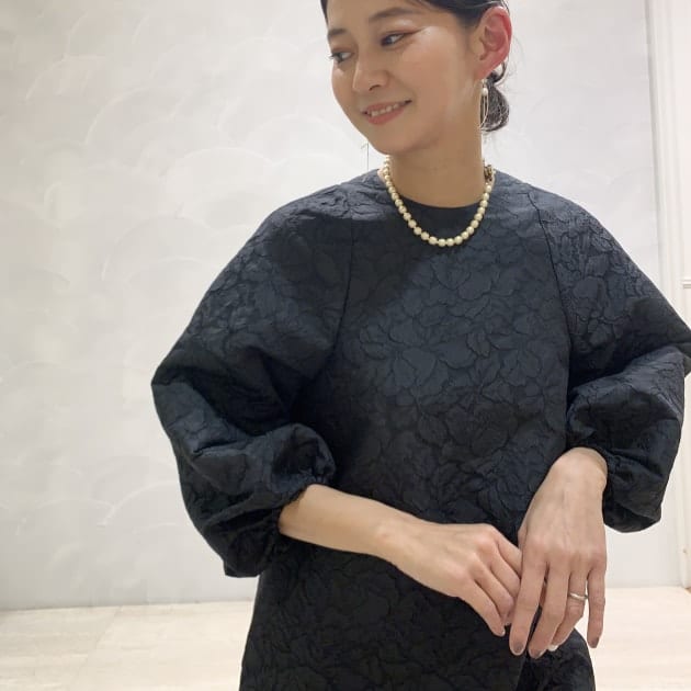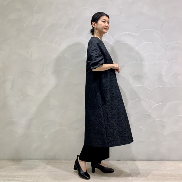 お袖にはゴムが入っておりふんわりシルエット。全体もややAラインでエアリー感がございます。1枚で十分な丈ですが、私はパンツを合わせてみました。こちらもまた、セレモニー以外にもお使いいただける嬉しいアイテムです。