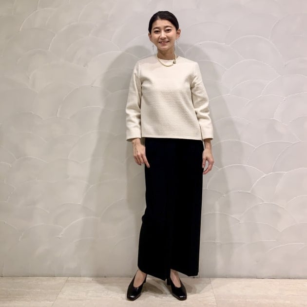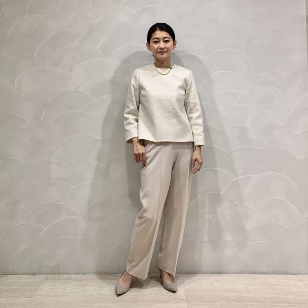 規定がない場合や、式典以外でも着られるものをお探しの方に◎。先程のテーパードパンツとは別の形のセミワイドパンツと合わせました。