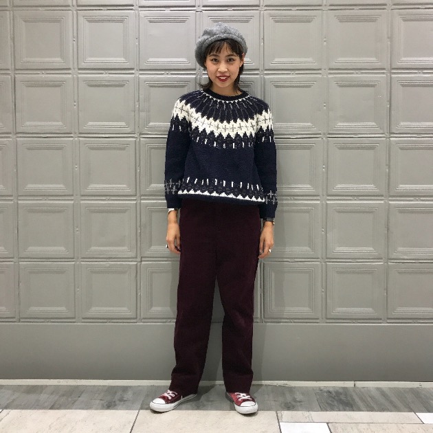 ニットに馴染むバーガンディーのコーデュロイパンツをチョイス。