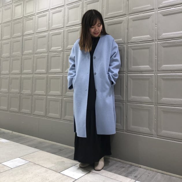 まずはこちらの、ノーカラーのコート!