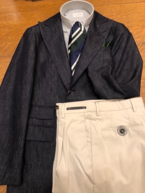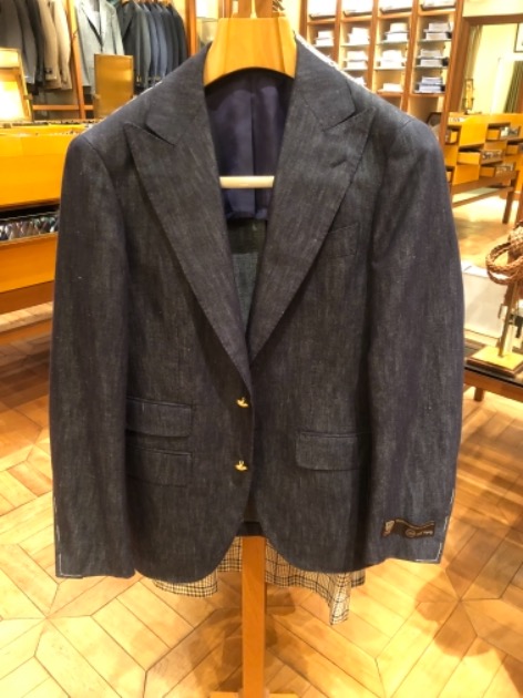 デニム調にピークドラペル、ゴールドメタルボタンというところに惹かれます。