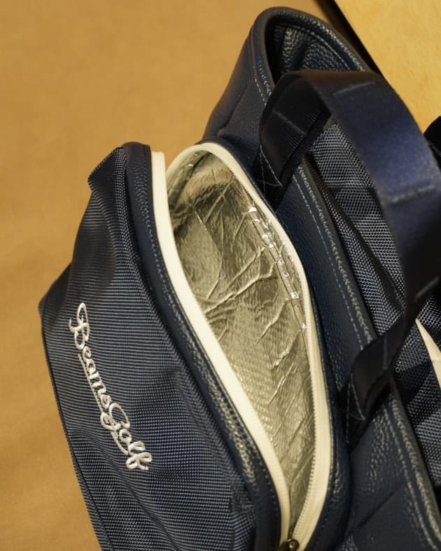 中には仕切りポケットが付き、ゴルフアクセサリーやスマートフォンなどの収納に便利です。