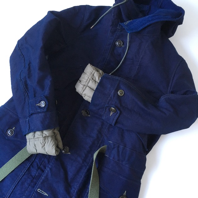 フロント周りや裾に配したテープには、1940年代U.S.NAVYが使用していたダッフルバッグのハンドルテープを染め直したヴィンテージパーツを配しています。(先日のブログでもご紹介しています。)