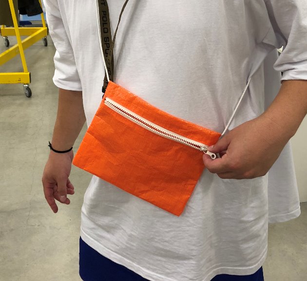 サコッシュのサイズ感は大男がもつとこんな感じになりました。携帯や財布、鍵などを入れてみましたが、素材が軽くて丈夫ですので、安心感が得られます。又、使って汚れても簡単にふき取れるのがGOODなポイントです。