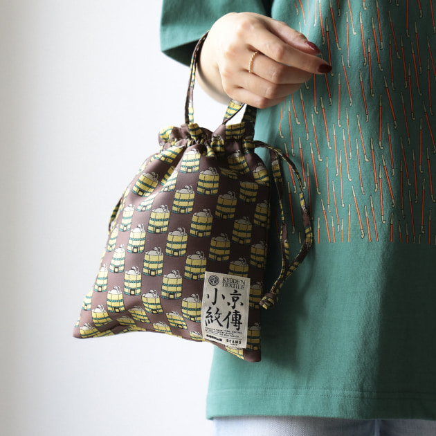 こちらも遊び心あふれるデザインを取り入れた巾着トートとちりめんスカーフ。